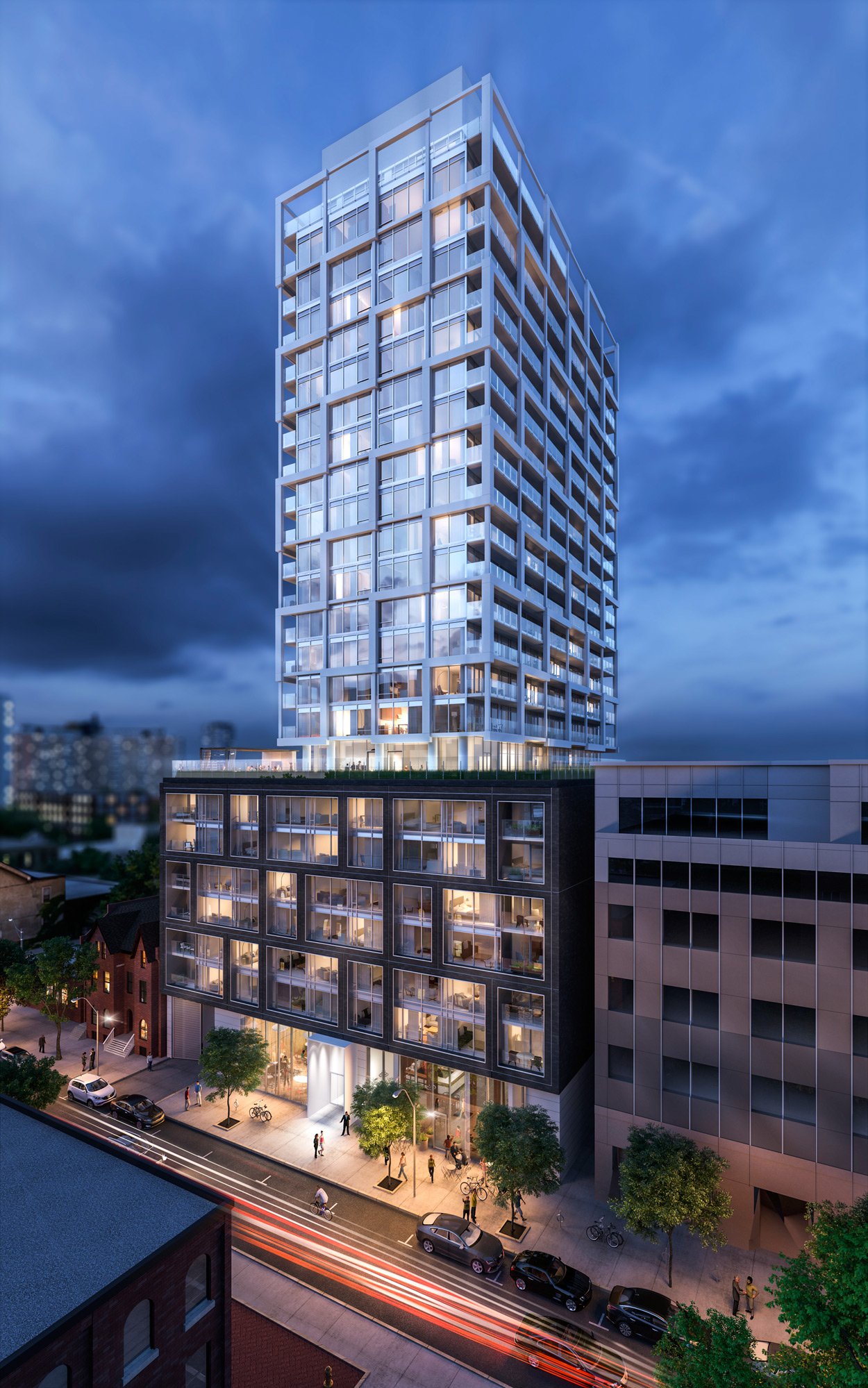 East Fifty Five represents the best of Toronto’s dynamic resurgence as a world city. Located in the heart of Toronto’s Lower East Side, East Fifty Five adheres to Lamb Development Corporation’s strict policy of beauty and excellence in architecture and design. East Fifty Five stands for simple clean lines and the “less is more” type of ideology with modern architecture. Just two materials are being used to clad East Fifty Five, white precast and black obsidian brick. Simple, strong, clean and beautiful.